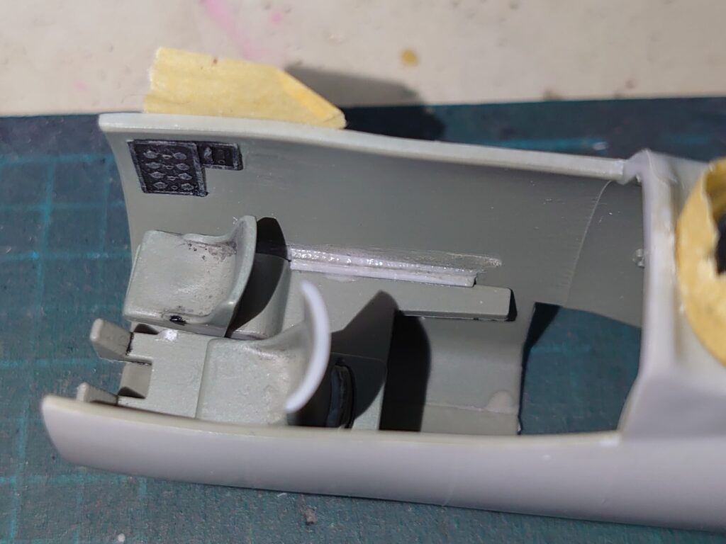 キットでは機首側面内部の出っ張りの上に床板を接着する指示が出ているけど……