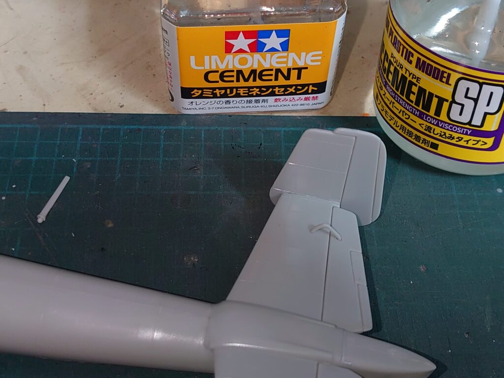 あらかた組み終わったので、尾翼のエレベーターと本体を接続する部品を接着。