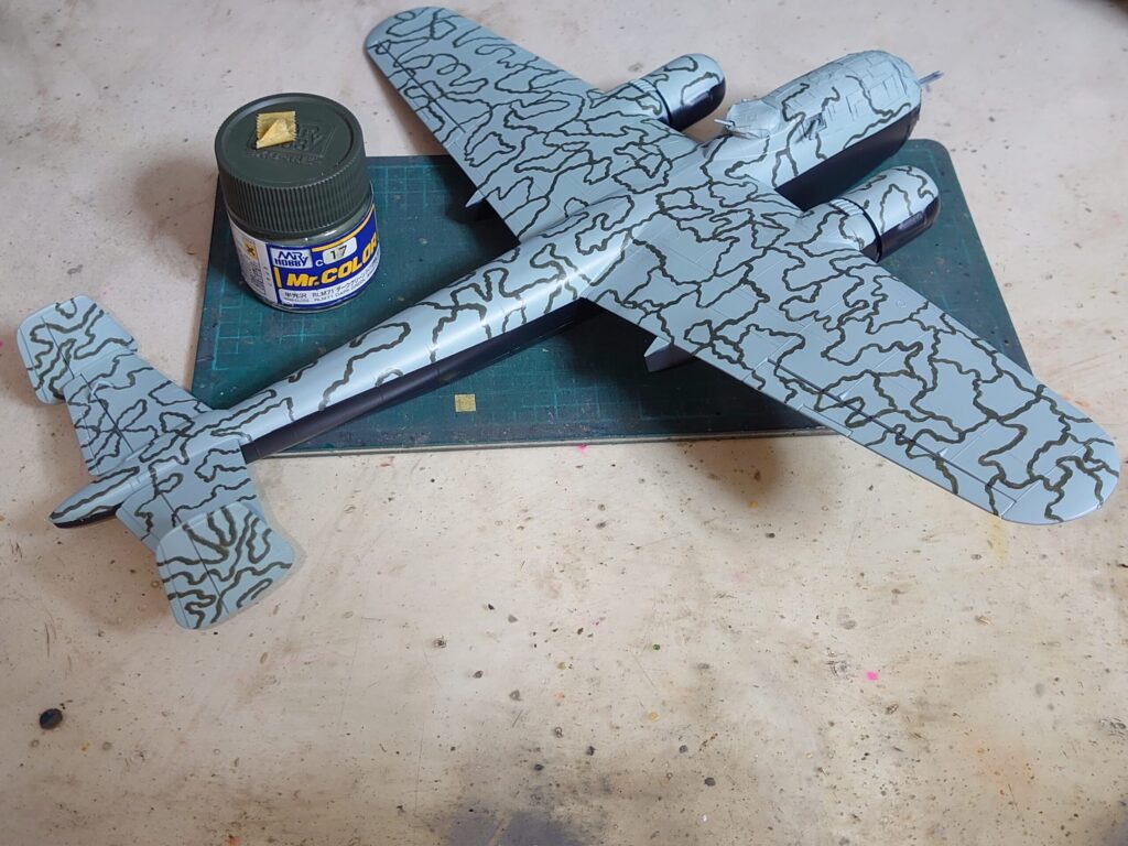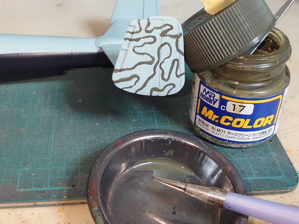 Mr.カラーのRLM71ダークグリーンを面相筆で、下書きをなぞるように塗っていきます。