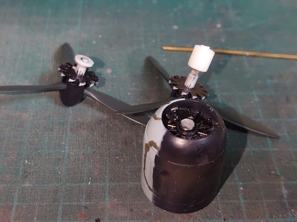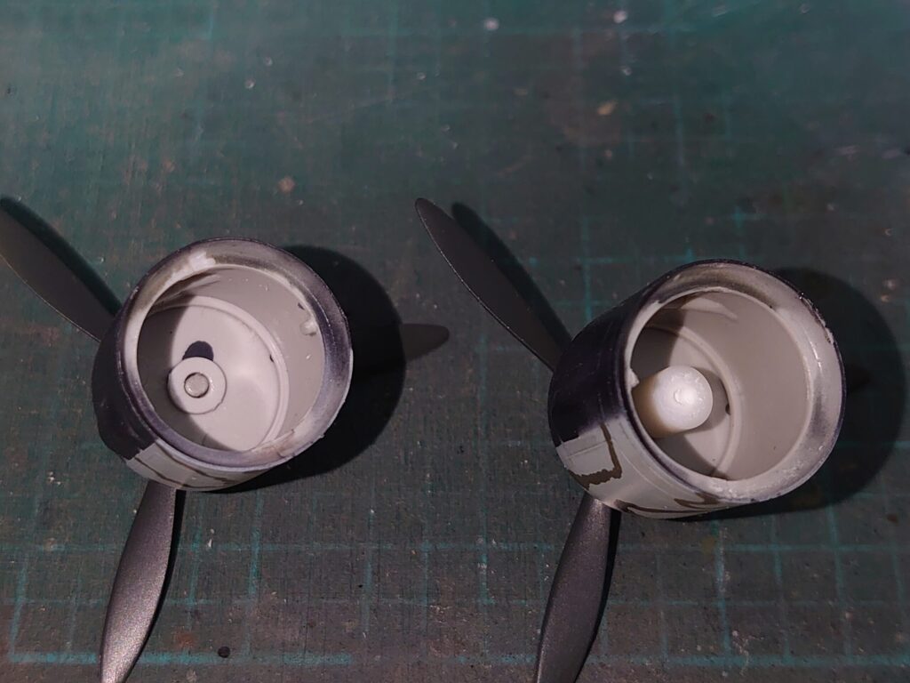 プロペラは内部からリング状の留め具パーツを軸に接着することで抜けないようにする。