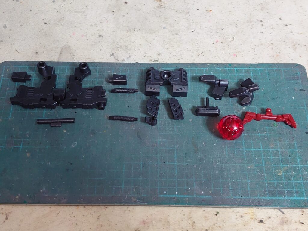 後は背面装甲パーツとキャップパーツを用意して、先ほど組み立てた頭部や胸部と組み合わせましょう。