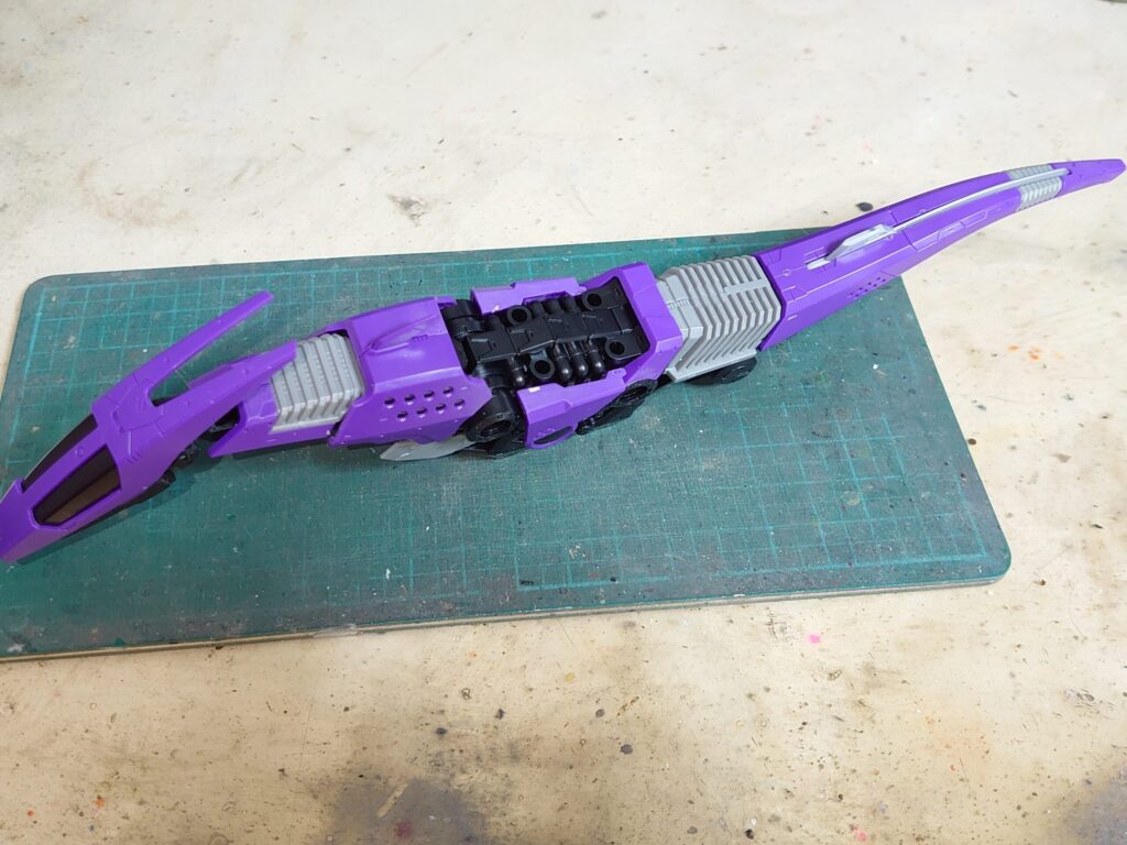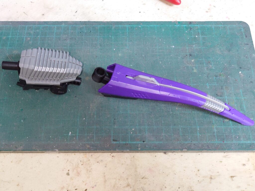 尻尾外装の紫色部分は左右から挟みこむ構造で、真ん中に合わせ目ができる。