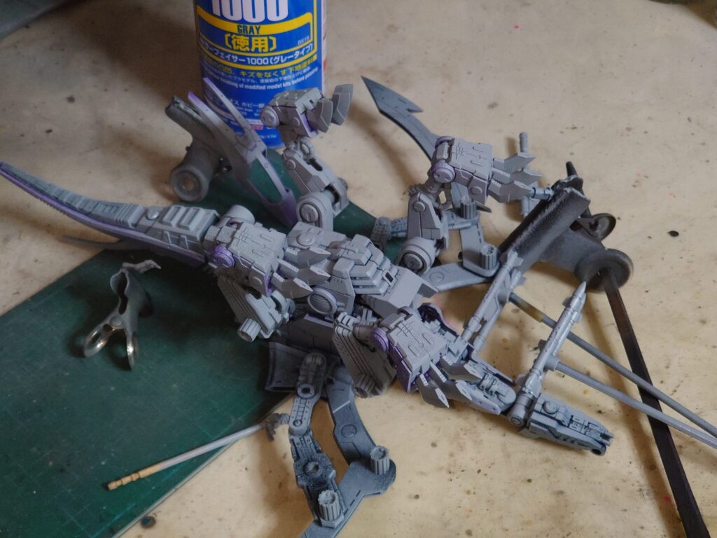 とりあえず手始めにクレオスの缶サーフェイサー、Mr.サーフェイサー1000を吹きつけ。