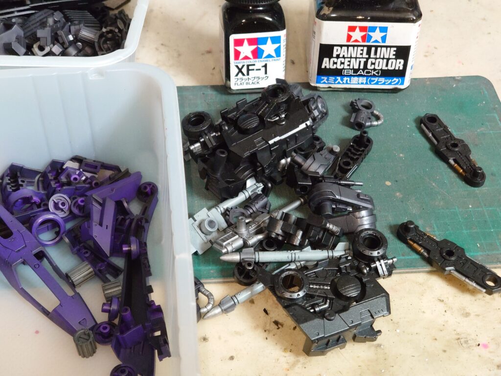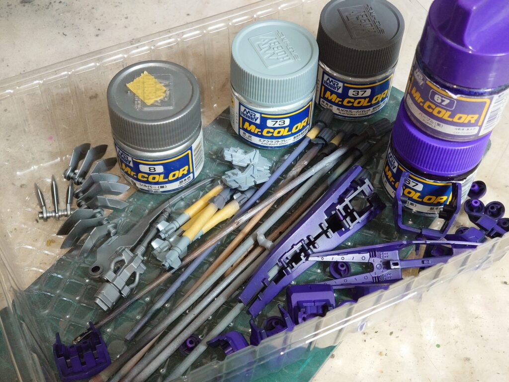 「紫色の部品の下地→紫色のパーツの塗装→銀色の部品の下地→銀色の部品の塗装……」