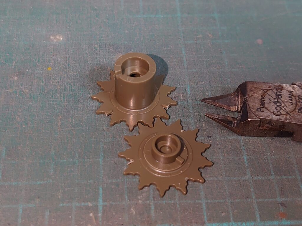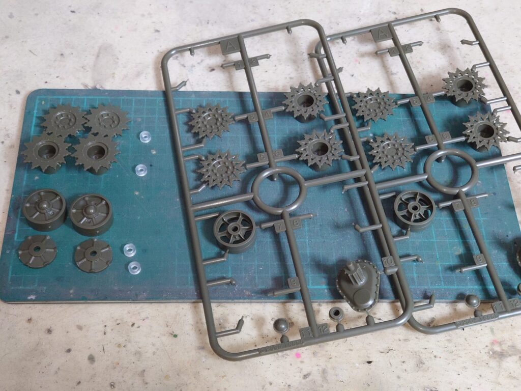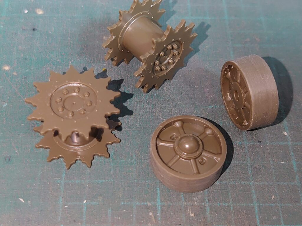 説明書だと履帯の次に機動輪・誘導輪を組む指示が出ています。
