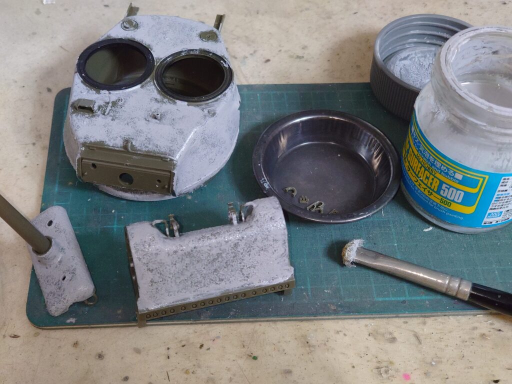 とりあえず削ったりした部分を誤魔化すため、上から溶きパテで鋳造表現。