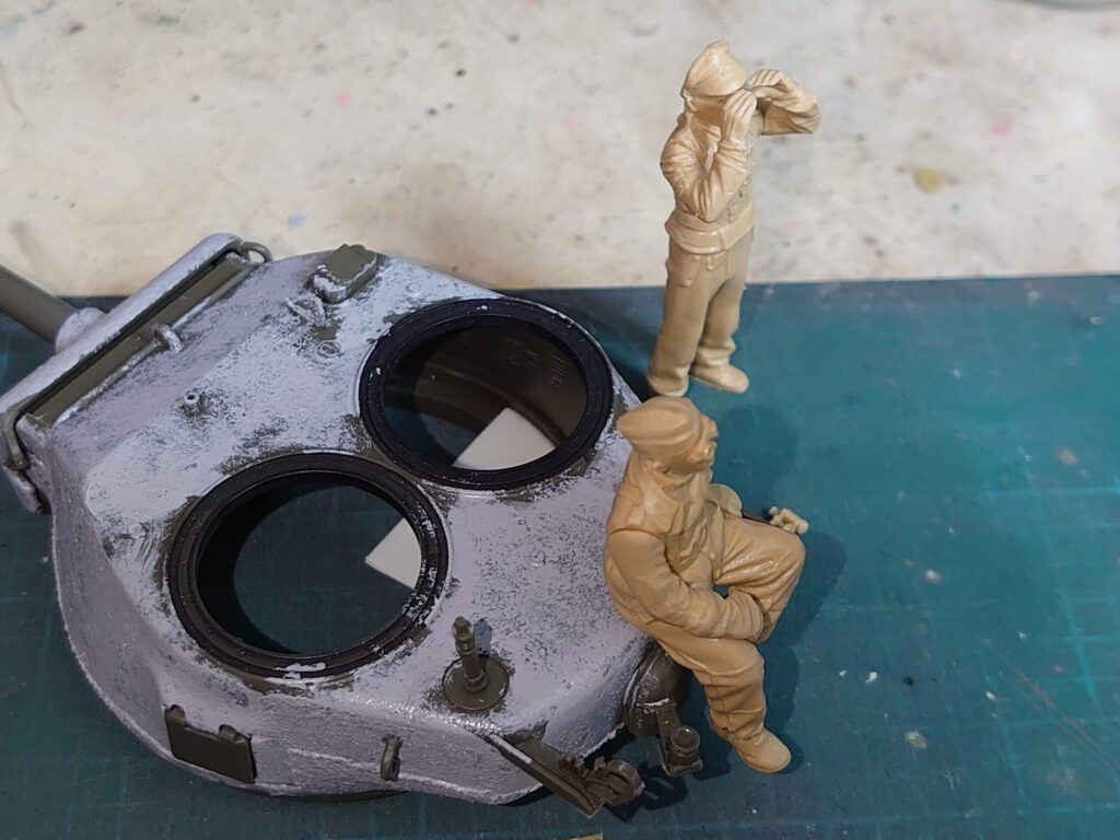 なにかいいものがないか探っていたところ、以前組んだタミヤのパンターG型(後期型)に付属した座っている兵士がほぼジャストフィットだった。