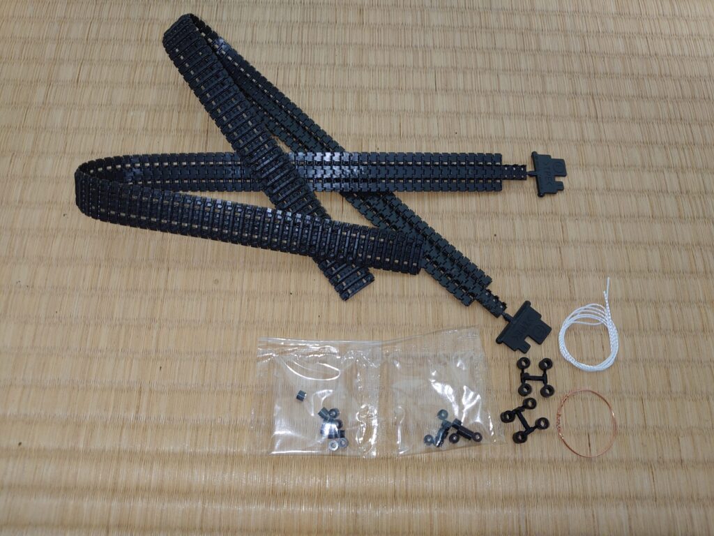大小のポリキャップの他、牽引ロープ用の糸やワイヤー再現のエナメル線、そしてベルト式履帯だ。