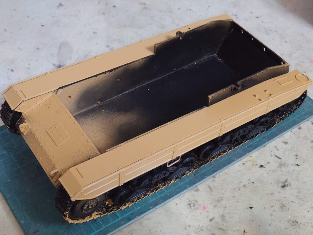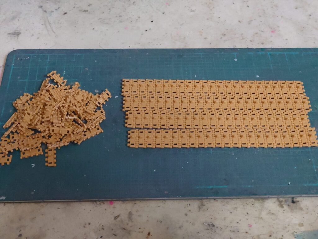 後にサイドスカートを取り付けると上面の履帯は下から見ない限りは見えなくなるので、仮に処理するなら下面だけでも大丈夫だろう。