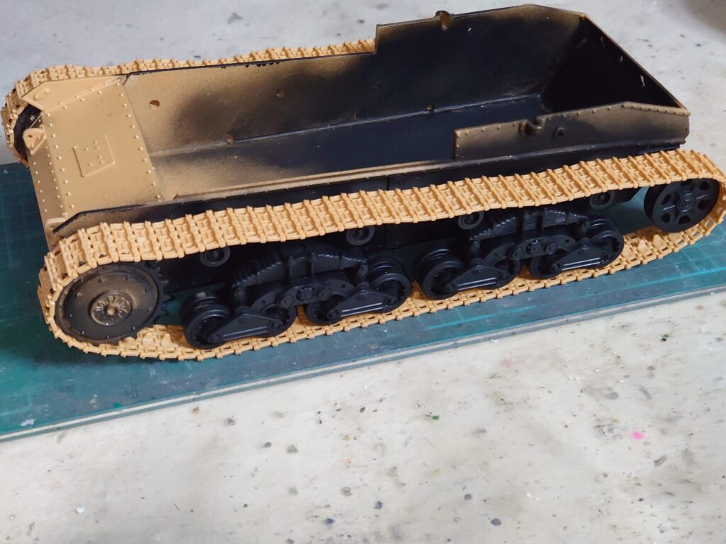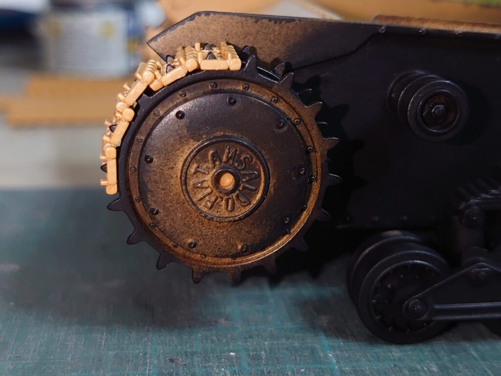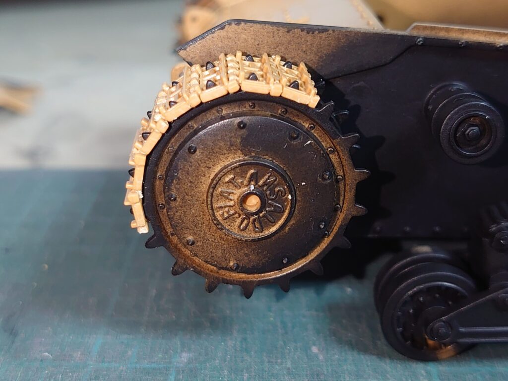 履帯パーツにある程度暗色を筆塗りして、そのままフェンダーやサイドスカートを取り付けてしまいます。