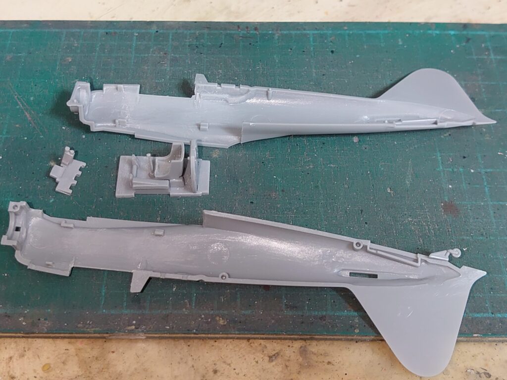 その後は計器のデカールを貼り付け、機内の簡易的な塗り分けをし、スミ入れからのドライブラシの後に胴体左右を貼り合わせて接着してしまいます。