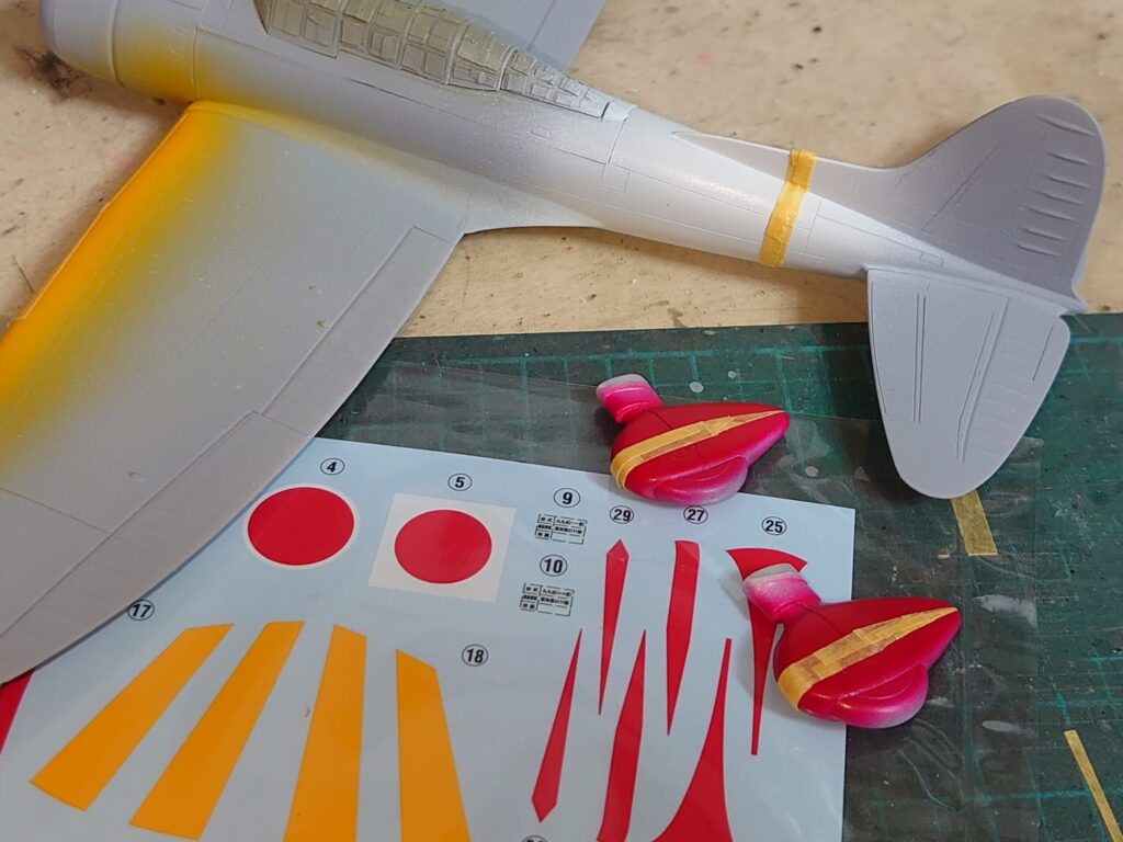 本体の白帯と主翼の黄色帯のように、近い部分の色は後から塗る色が飛び散らないように注意だ。
