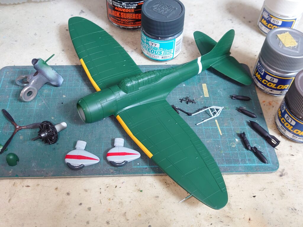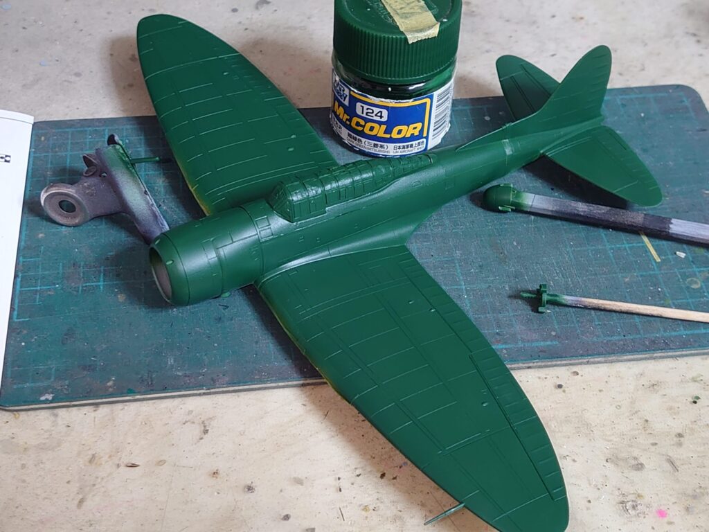 キットの指定ではMr.カラー15番の暗緑色(中島系)ですが、筆者は今回Mr.カラー124番の暗緑色(三菱系)で仕上げていますな。