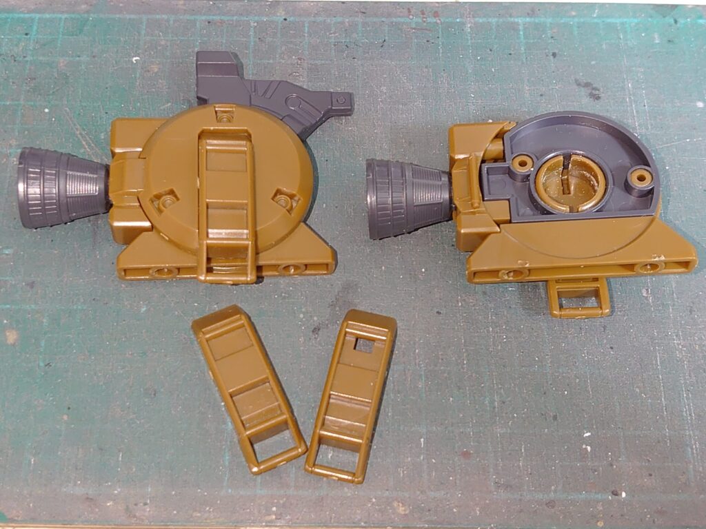 仮組み段階でも少し触れたけど、右側の火器アタッチメントは真っ二つな構成。