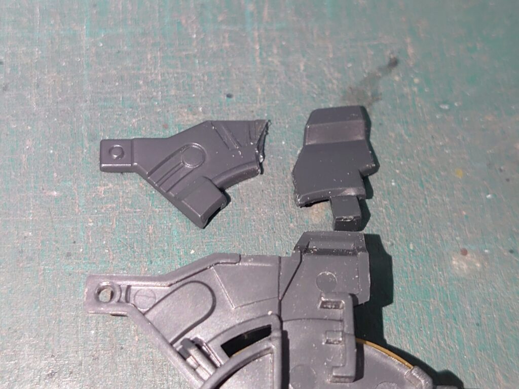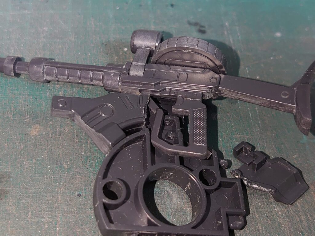 上の画像で言う、ザクマシンガンのピストルグリップが触れている辺りを切削しているようです。