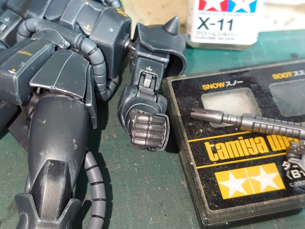 前回も使用したタミヤエナメルのクロームシルバーを使い追加のドライブラシやチッピング。