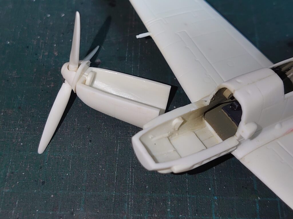 プロペラは先に組み立てて、機首上下の外装で挟み込む構造になっていますな。