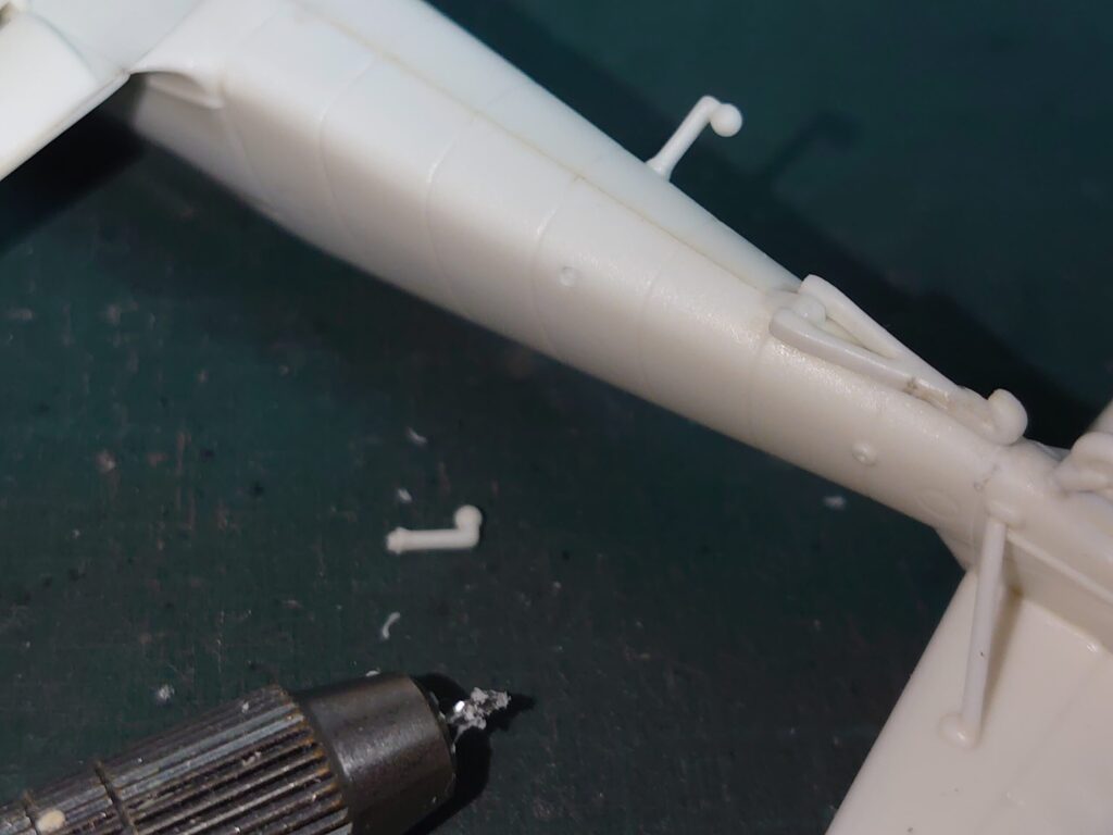 風防上のアンテナ線支柱も、ここで取り付けると作業中に破損しそうだったので後回し。